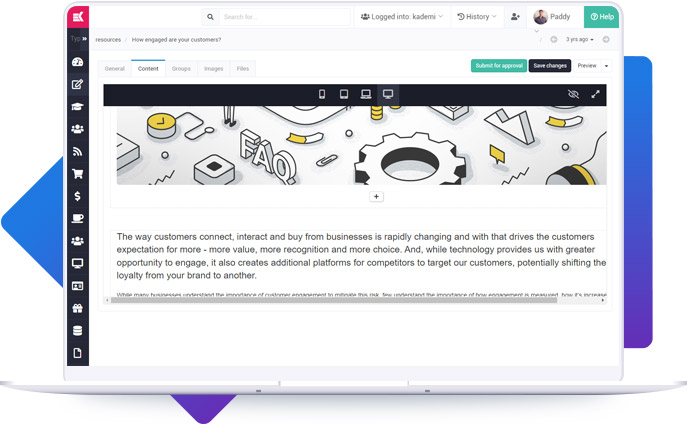 • Design blog article by dropping in images, videos, and text using K-Editor.