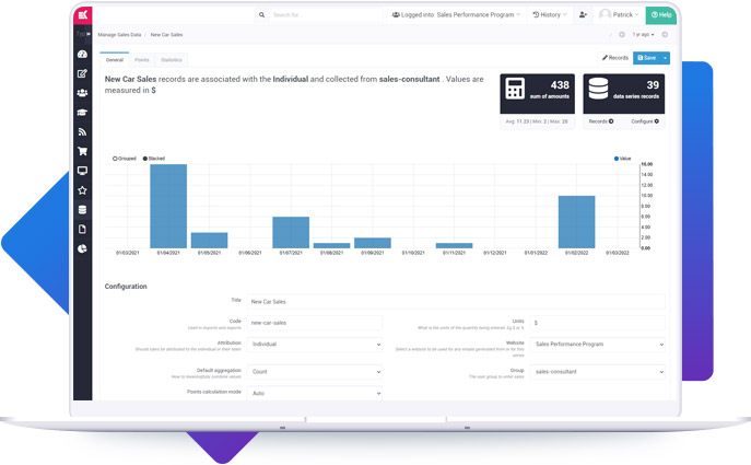K-Sales Data provides features to upload different types of data for use in programs, for example, sales data or offline training results. Data is then used to calculate sales incentive payouts or track KPIs.