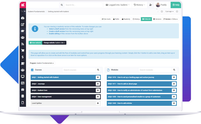 Training can be structured using programs and courses, then modules created containing learning content and assessments.