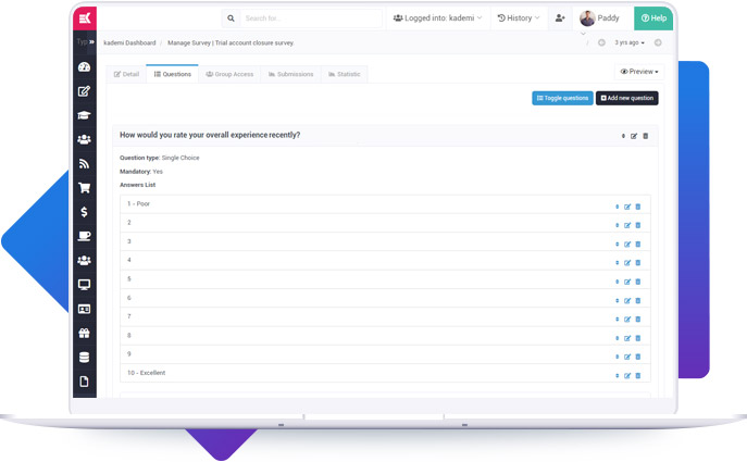 K-Survey gives customers tools to easily create questions and responses through an easy-to-use survey builder interface. Surveys can be emailed to customers or form part of a customer journey that triggers the survey after an event.